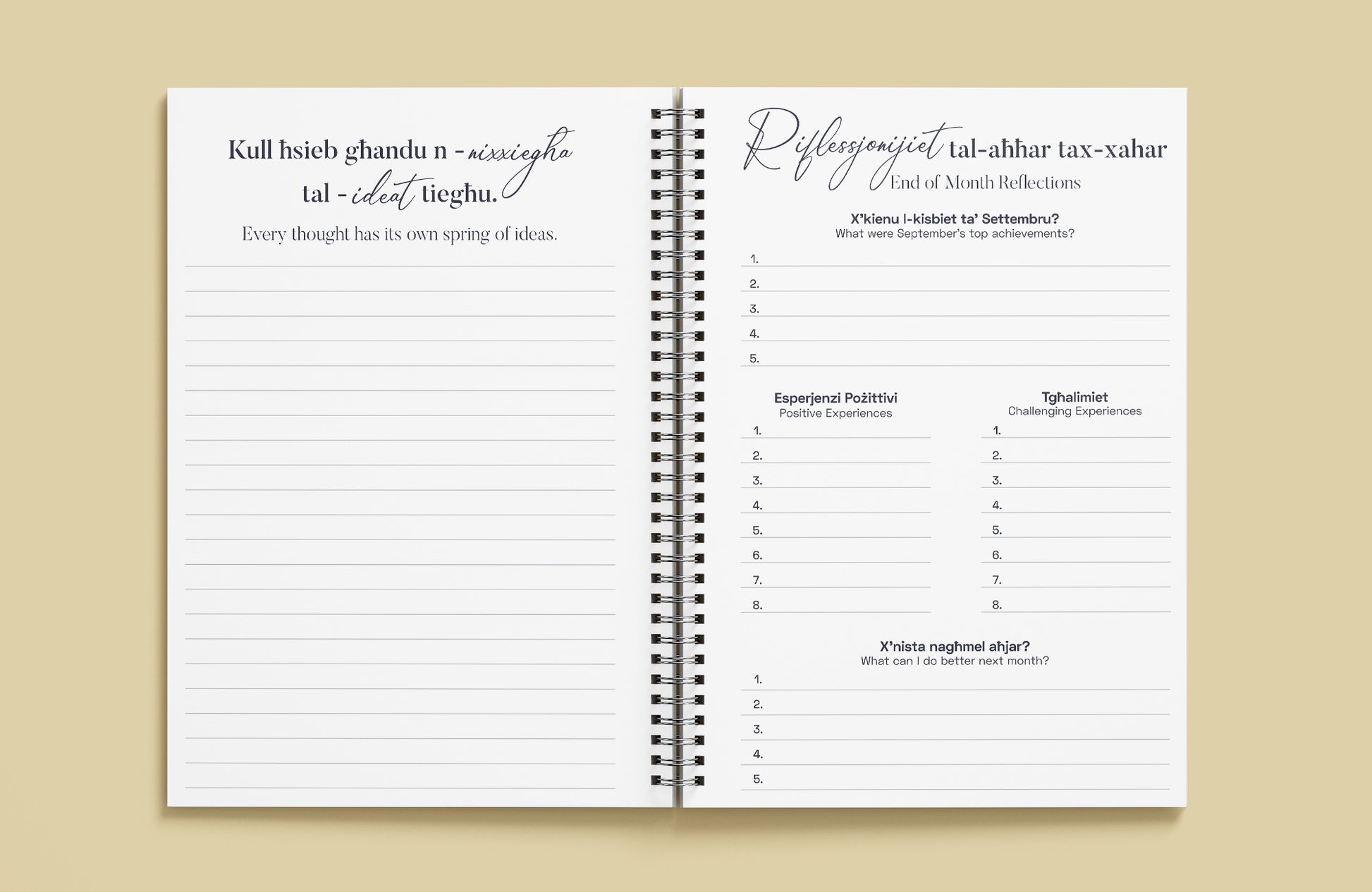 Thoughtfully created and inspired by nature, the Baħar Weekly Diary encourages mindfulness, creativity, and gentle organisation. Whether used for work, study, or personal planning, it offers a calm and uplifting space where your ideas and intentions can flow as freely as the sea itself.